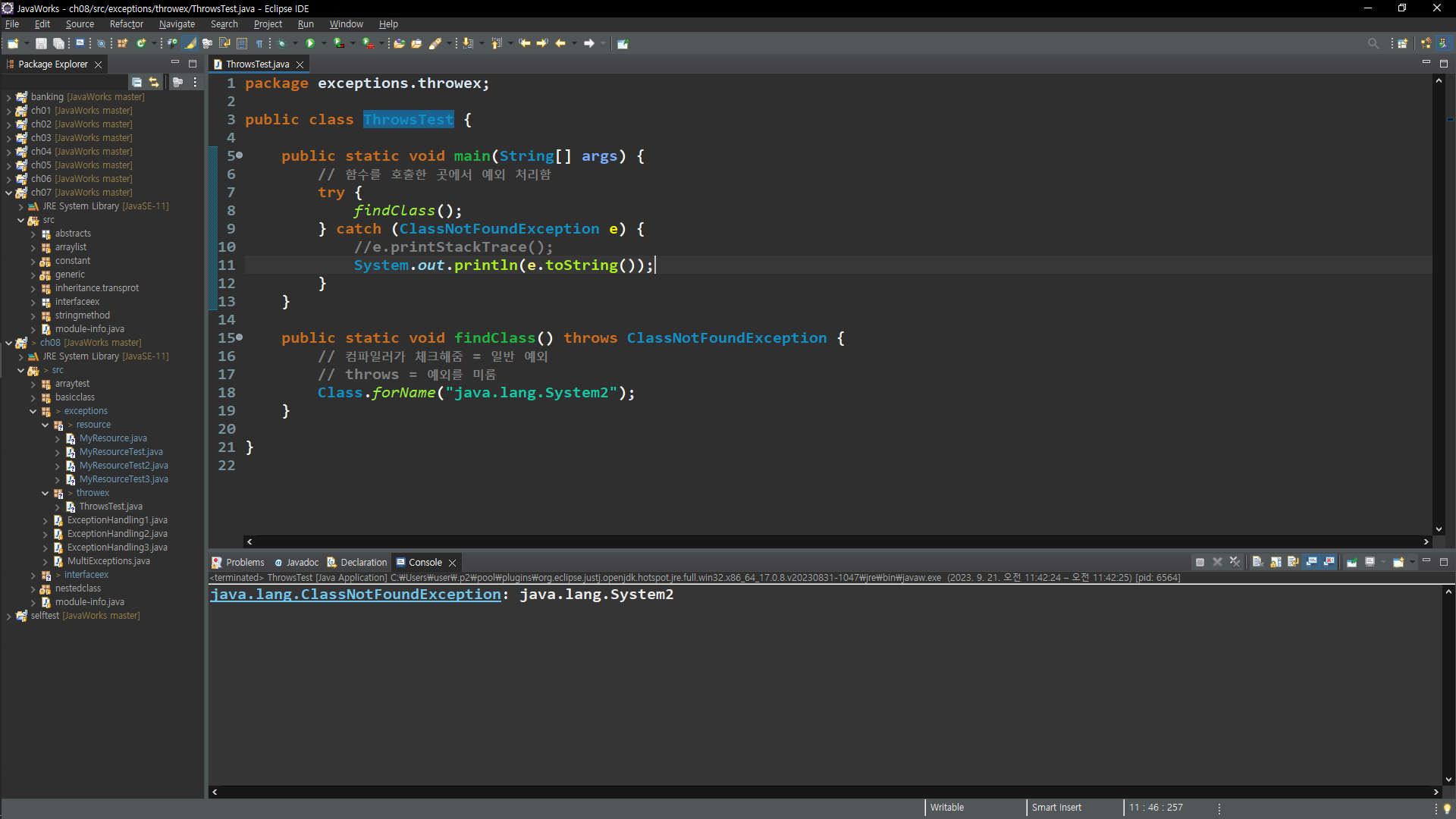 실행(RunTime) 예외 = 실행했을 때 오류 발생 -> 개발자의 경험이나 예측으로 예외 코드 작성