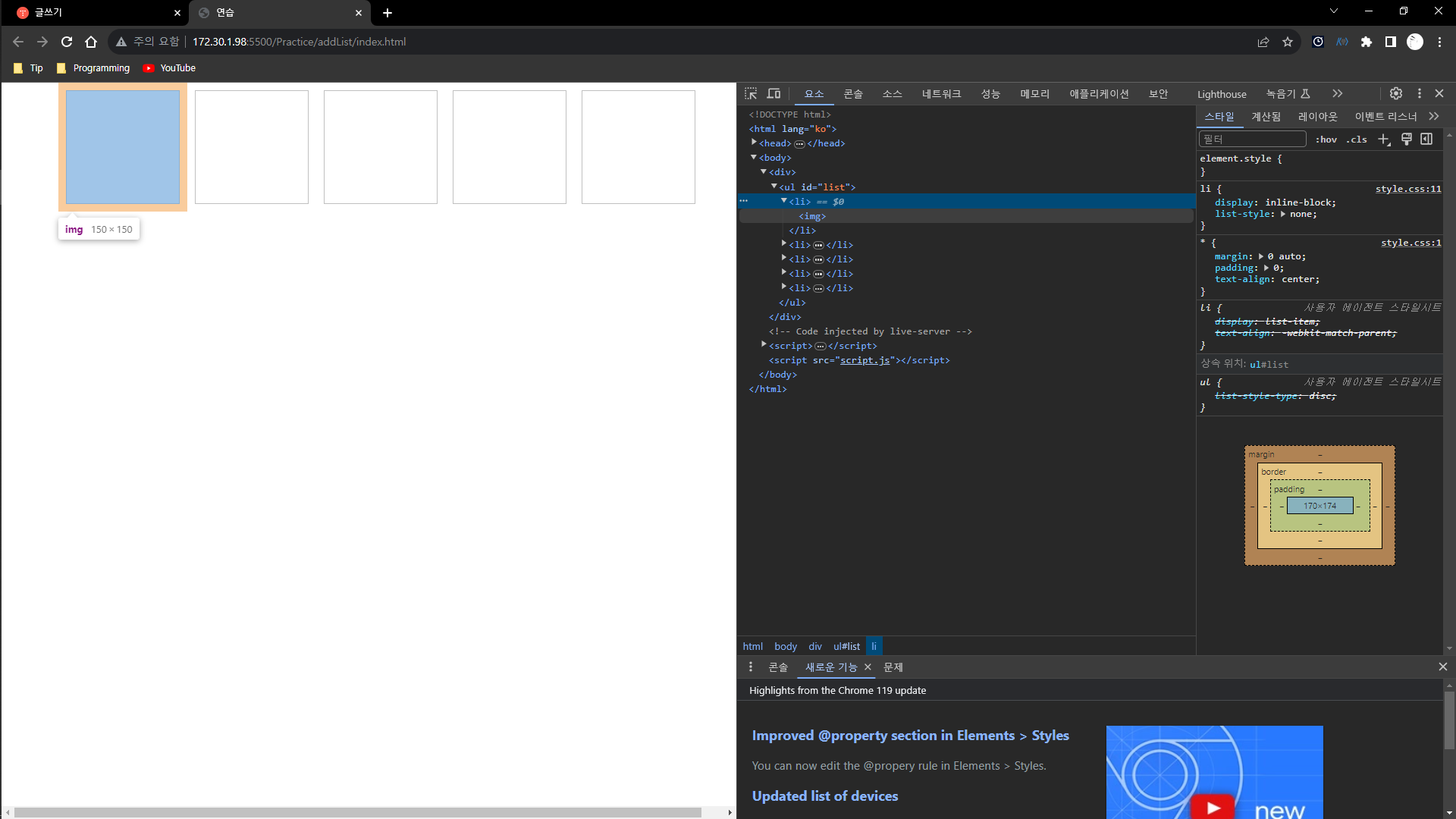 JS 코드를 통해 페이지에서 바로 생성된 모습